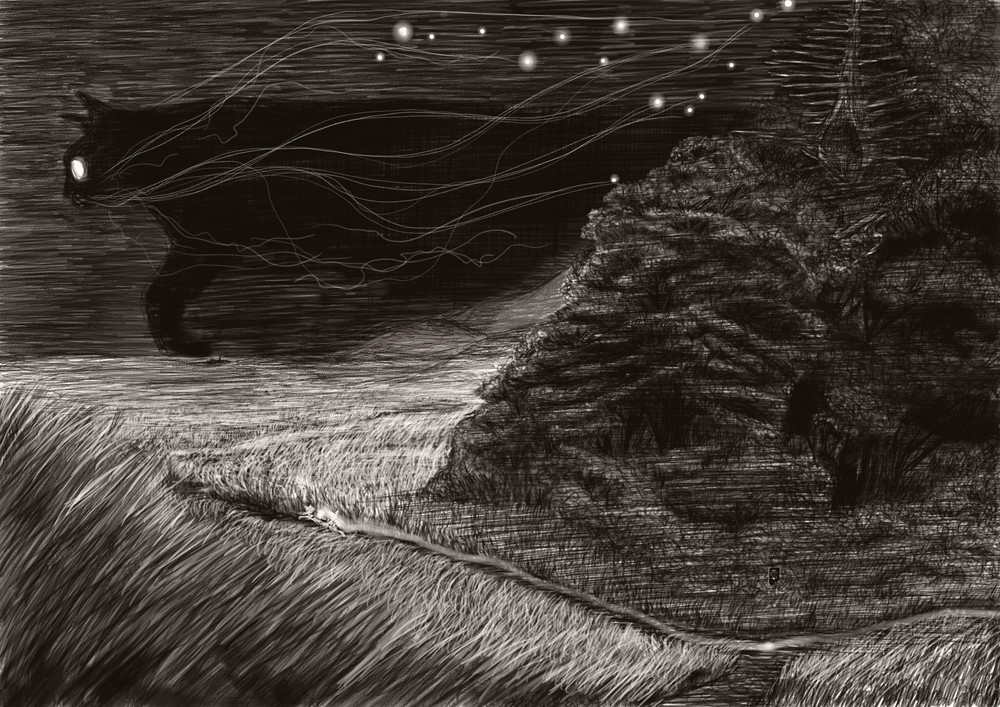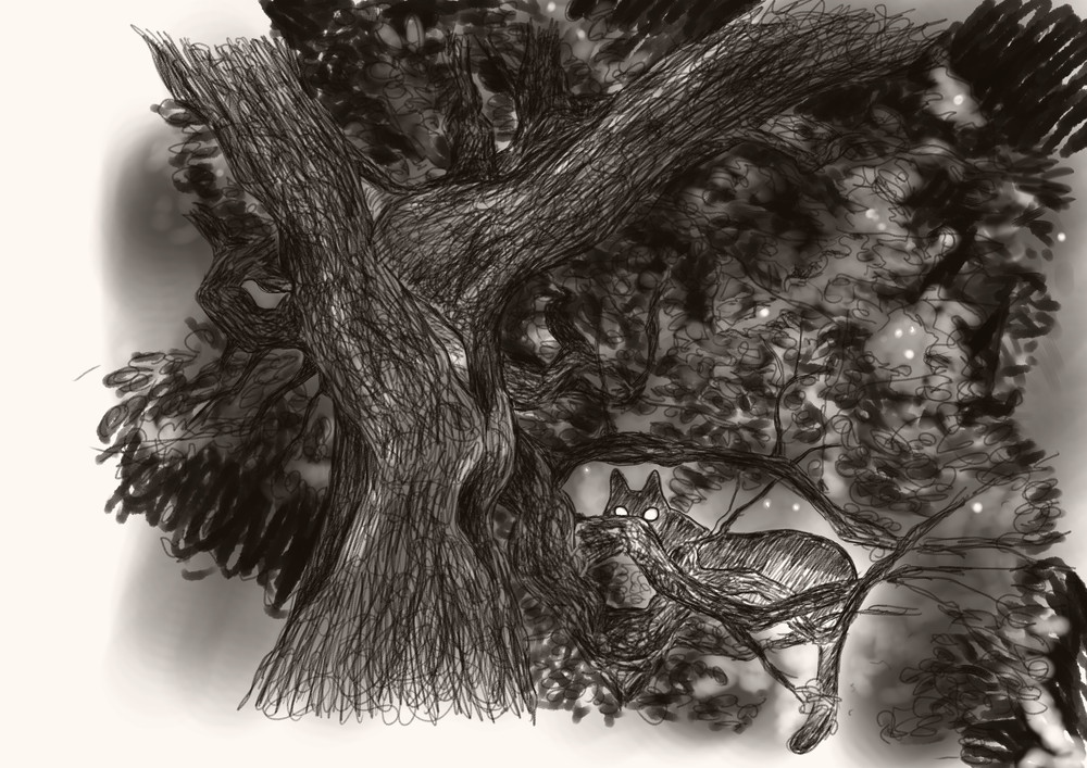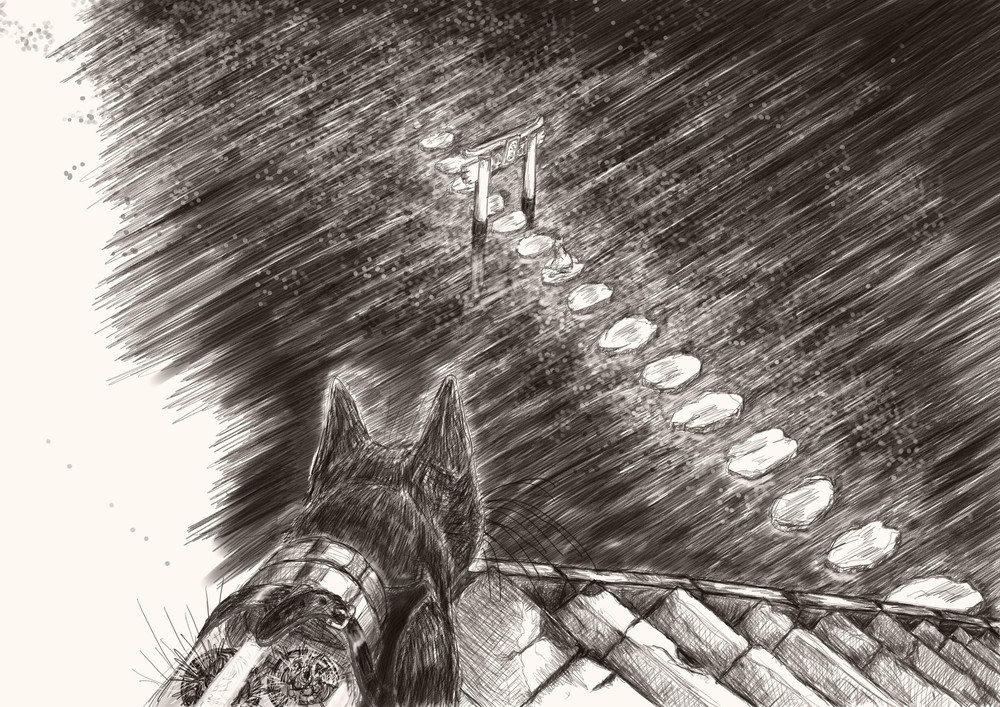 ひさが耳をぴくぴくと動かして声のしたほうを見上げると木の枝の上から灰色の大きな猫が、光る目でひさを見下ろしていた。